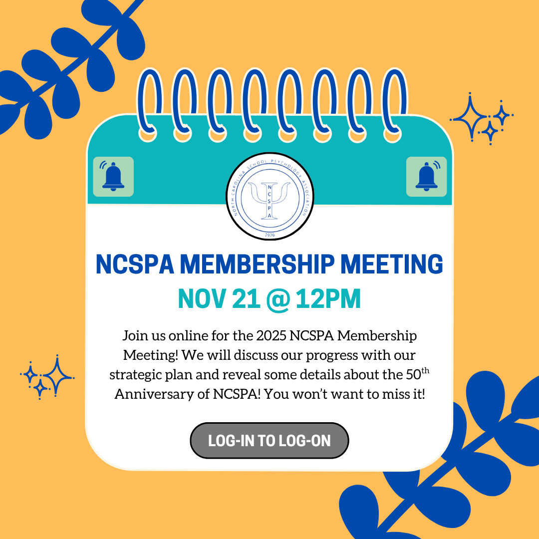NCSPA Upcoming Professional LearningLunch, Learn, & Collaborate (for members only)Volunteer to help facilitate Lunch, Learn, & Collaborate sessionsDo you have information you want to share with school psychologists? Let us know and we'll work to schedule you as a presenter for a Lunch, Learn, & Collaborate session!